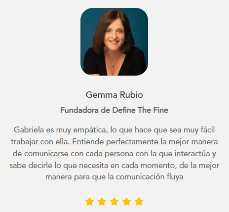 Gabriela es muy empática, lo que hace que sea muy fácil trabajar con ella. Entiende perfectamente la mejor manera de comunicarse con cada persona con la que interactúa y sabe decirle lo que necesita en cada momento, de la mejor manera para que la comunicación fluya