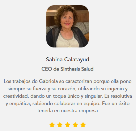 Los trabajos de Gabriela se caracterizan porque ella pone siempre su fuerza y su corazón, utilizando su ingenio y creatividad, dando un toque único y singular. Es resolutiva y empática, sabiendo colaborar en equipo. Fue un éxito tenerla en nuestra empresa